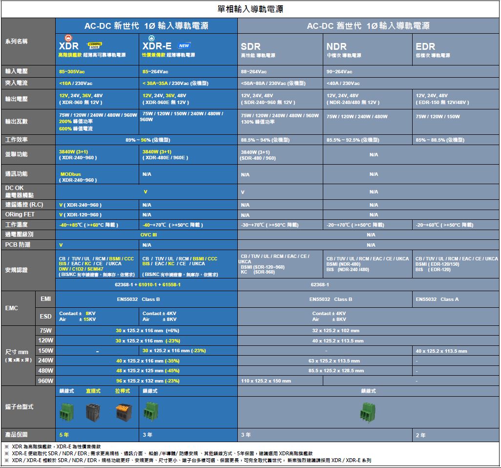 明纬 SDR / NDR / EDR 三系列 75W~960W上市至今 10 多年,备受市场肯定,销售累计高达数千万台,广泛应用于工业自动化、电力设施、新能源设备、网络交换机、或半导体制程设备….等,为了提供更超值选择,重磅推出了全新家族 XDR-E 系列 75W/120W/150W/240W/480W/960W。