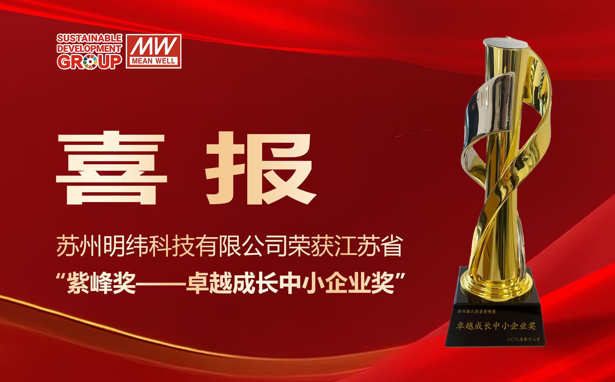 全球标准电源制造商——明纬集团(MEAN WELL)很荣幸宣布,苏州明纬科技有限公司于 12 月 16 日举行的第四届江苏省紫峰奖发布仪式中,凭借卓越的创新实力,荣获「卓越成长中小企业奖」肯定,充分展现明纬长期深耕市场、持续精进的经营成果。